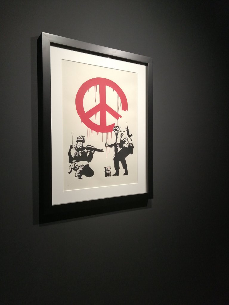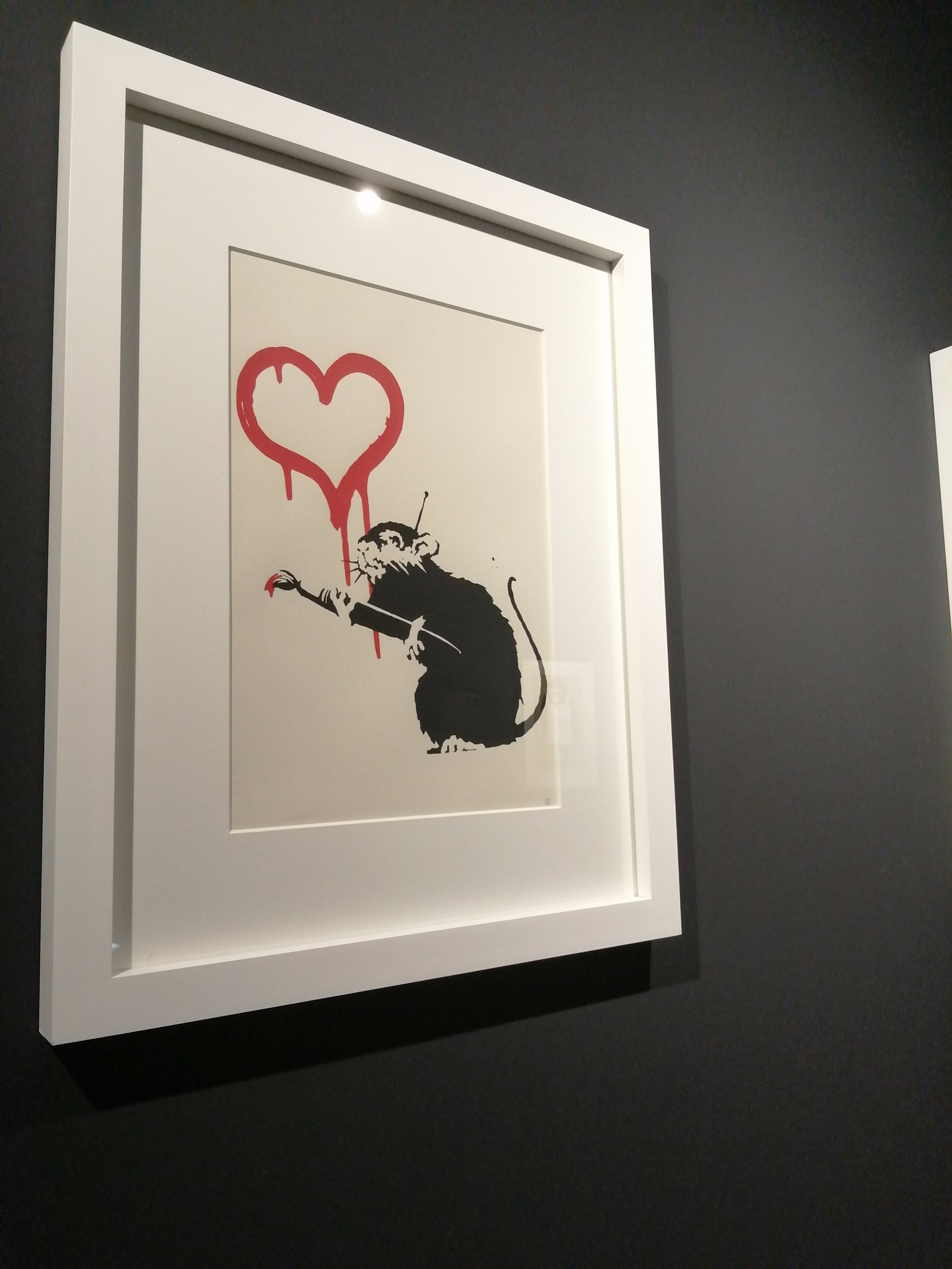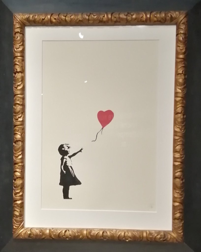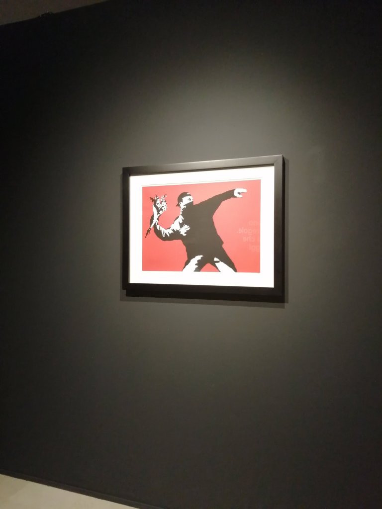 Verranno presentati vari lavori e video ma l’attenzione non potrà non essere catapultata da Girl with Balloon, serigrafia su carta risalente al 2004 e 2005, e da “Love is in the Air“, che riproduce un giovane che lancia un mazzo di fiori.